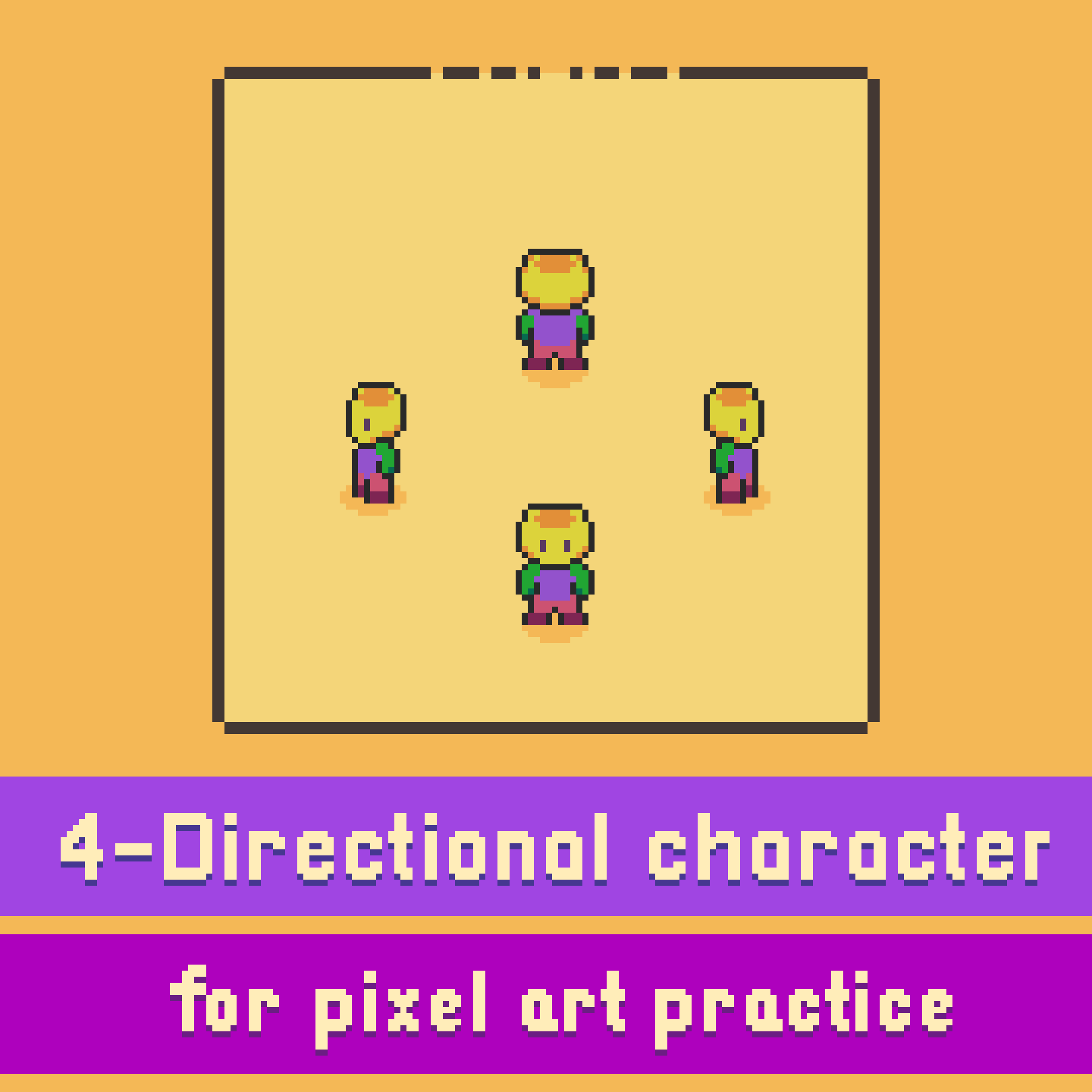 This pack includes a top-down pixel art character shown in four directions (up, down, left, right). Perfect for learning 2D character design — customize colors, add details, and adjust the look to fit your own game.